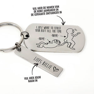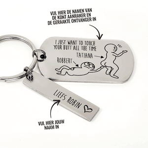 I just want to touch your butt all the time Sleutelhanger. Op veler verzoek is het nu mogelijk om ook een eigen tekst op de dogtag te zetten. Wie ga jij verrassen met deze unieke gepersonaliseerde sleutelhanger?