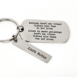 Vrienden komen en gaan, Maar soms heb je de jackpot en heb je een vriend voor altijd. Veras die vriend met deze mooie "Iedereen heeft een vriend tijdens elke fase in het leven. Alleen de meest gelukkige heeft een vriend tijdens alle fases van het leven" RVS sleutelhanger. Je kunt de sleutelhanger personaliseren door namen toe te voegen. Zo word dit een nog persoonlijker cadeau