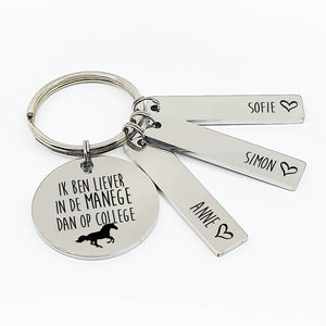 Ben jij gek op je paarden en ben je niet weg te slaan bij de manege? of ken je iemand die gek op zijn of haar Paard(en) is? Dan is deze 'Ik ben liever op de manege dan op college' sleutelhanger een leuk cadeau! Personaliseer de sleutelhanger door er de namen van de paarden er aan toe te voegen.