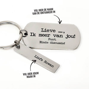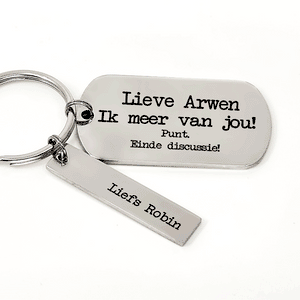 .. Ik meer van jouSleutelhanger. Op veler verzoek is het nu mogelijk om ook een eigen tekst op de dogtag te zetten. Wie ga jij verrassen met deze unieke gepersonaliseerde sleutelhanger?