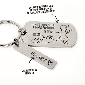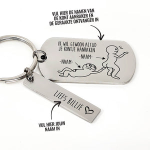 Ik wil gewoon altijd je kontje aanraken Sleutelhanger. Op veler verzoek is het nu mogelijk om ook een eigen tekst op de dogtag te zetten. Wie ga jij verrassen met deze unieke gepersonaliseerde sleutelhanger?