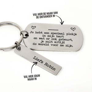 Je hebt een speciaal plekje in mijn hart en wat er ook gebeurt, je zult altijd de wereld voor me zijn RVS sleutelhanger. Op veler verzoek is het nu mogelijk om ook een eigen tekst op de dogtag te zetten. Wie ga jij verrassen met deze unieke gepersonaliseerde sleutelhanger?
