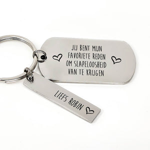 Zo klein zo hulpeloos, maar ooh wat een geluid! Onze "Jij bent mijn favorite reden om slaaploosheid van te krijgen" RVS sleutelhanger is voor alle mama's en papa's die zich hier in kunnen vinden. Je kunt de sleutelhanger personaliseren door een naam toe te voegen