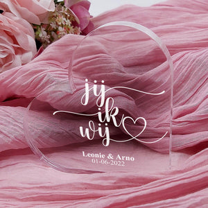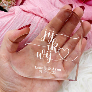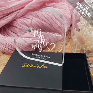 Doe vandaag nog een prachtig plexiglas hart met persoonlijke boodschap cadeau. Lasergegraveerd met eigen namen en een dikte van 1 cm.