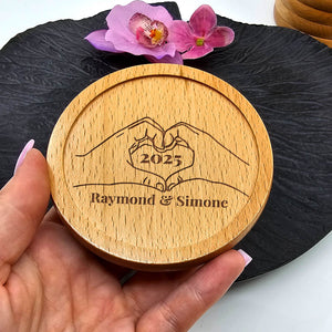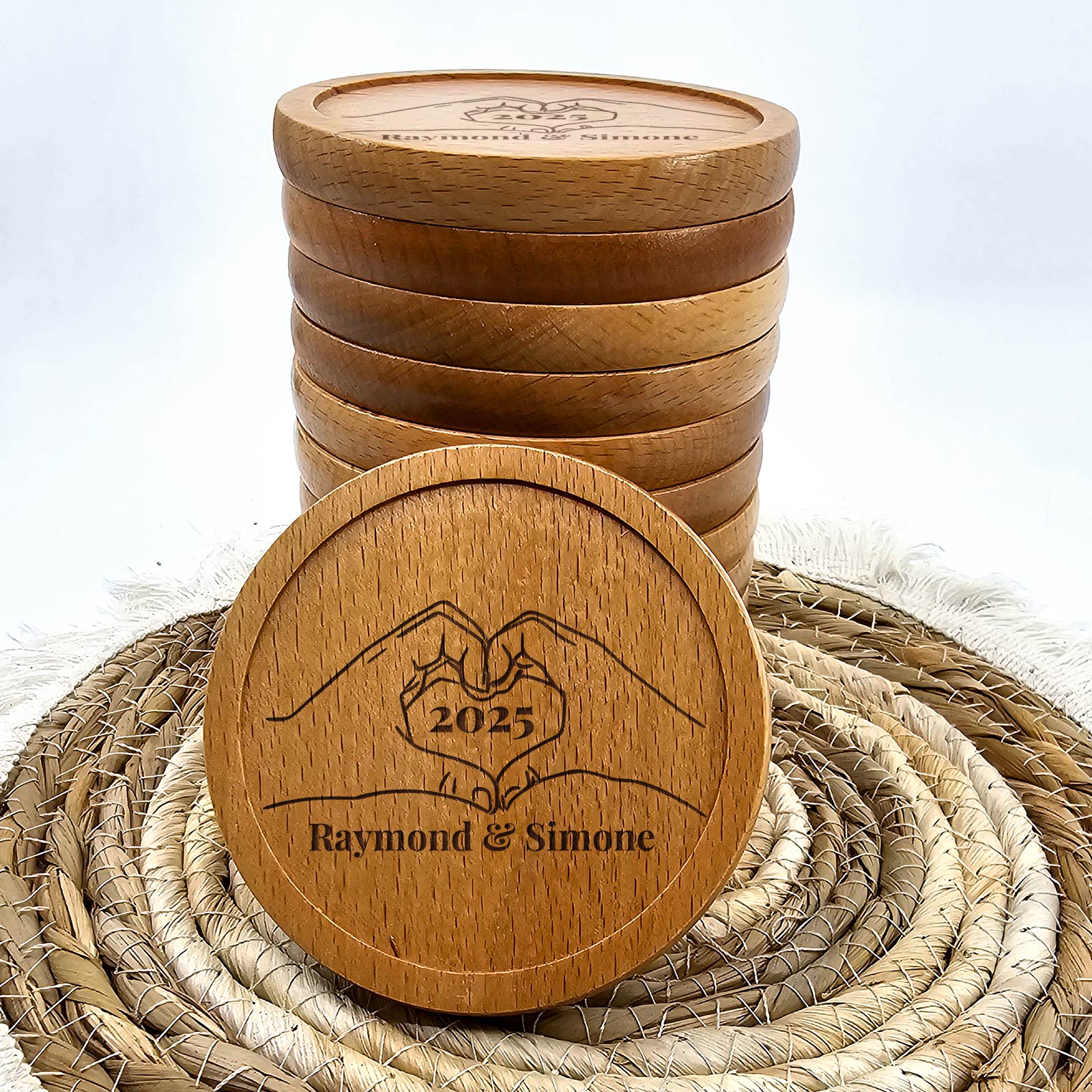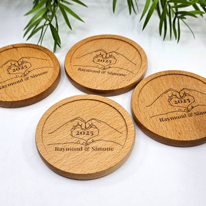Prachtige onderzetters gegraveerd met eigen namen en jaartal. Compleet afgewerkt met 2 handen in hartvorm,