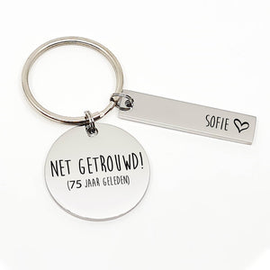 75 Jaar getrouwd? Maar voelt het nog als de dag van gister? Laat jou geliefde weten hoeveel je van hem/haar houd en geef deze handgemaakte 'Net getrouwd! 75 jaar geleden' sleutelhanger cadeau. Zo'n mijlpaal mag wel gezien worden! Personaliseer de sleutelhanger door jouw naam er aan toe te voegen.