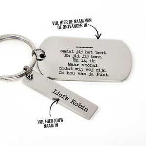 Omdat jij het bent. En jij, jij bent. En ik, ik. Maar vooral omdat wij, wij zijn. Ik hou van je.Punt. RVS sleutelhanger. Op veler verzoek is het nu mogelijk om ook een eigen tekst op de dogtag te zetten. Wie ga jij verrassen met deze unieke gepersonaliseerde sleutelhanger?
