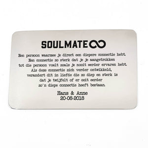 Onze RVS Kaartjes zijn perfect als kaartjes in de portemonnee of als bordje op op een deur. "Soulmate - Een Diepere Connectie Stalen Kaartje" is lasergegraveerd met de hand op hoogwaardig RVS-materiaal.