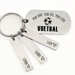 Ben jij ook zo gek op voetballen? Of het kijken van een voetbal wedstrijd? Onze "Mijn sport, mijn spel, mijn leven. Voetbal" RVS sleutelhanger is dan de sleutelhanger voor jou. De sleutelhanger is te personaliseren door namen toe te voegen.