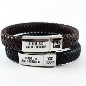 Jouw tekst voor de bovenste en onderste regel van het kleine gedeelte van de armband. Let Op: Hoe meer karakters, hoe kleiner de letters. Max 10 karakters per regel: