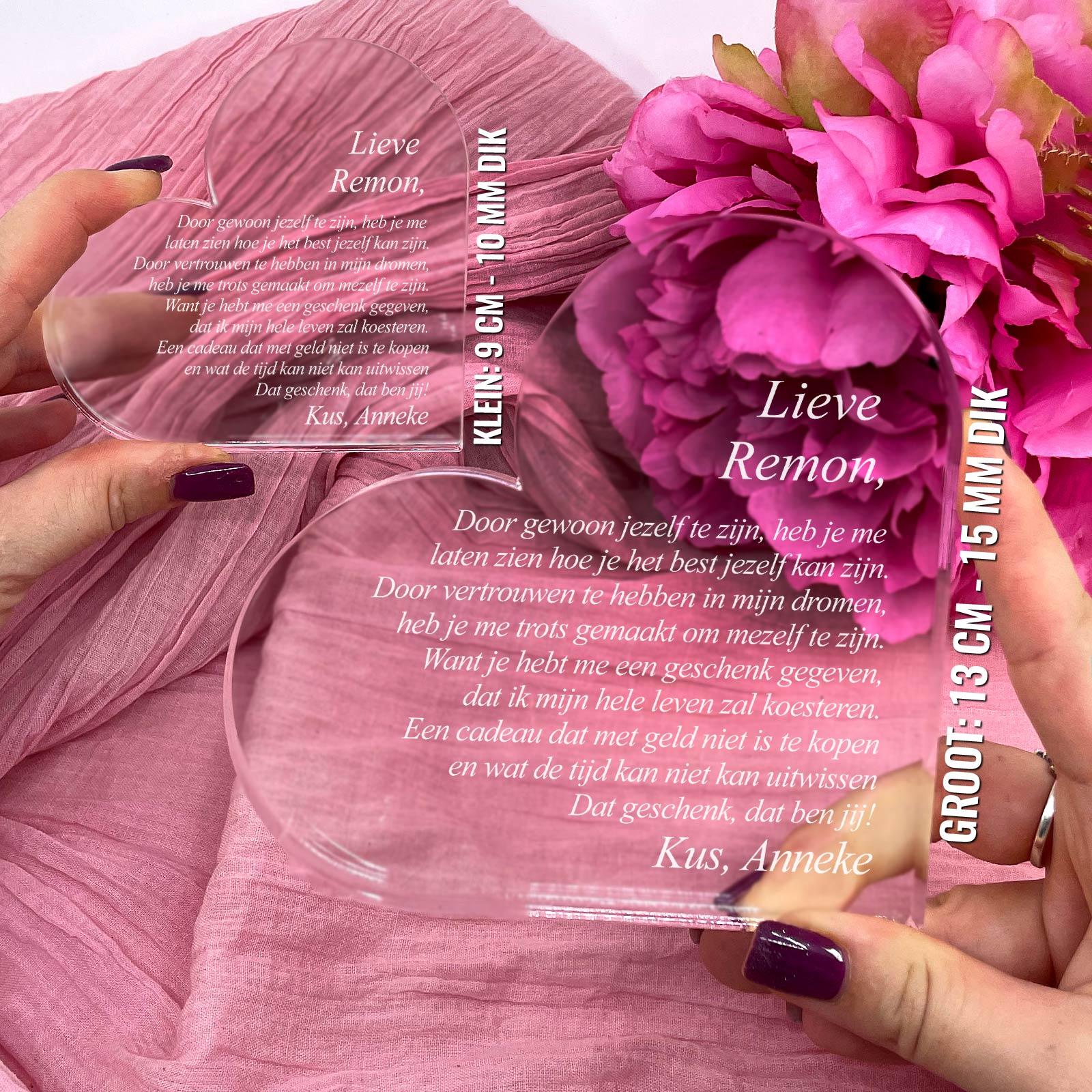 Doe vandaag nog een prachtig plexiglas hart met persoonlijke boodschap cadeau. Lasergegraveerd met eigen namen en een dikte van 1 cm.