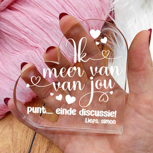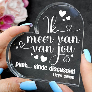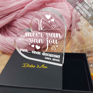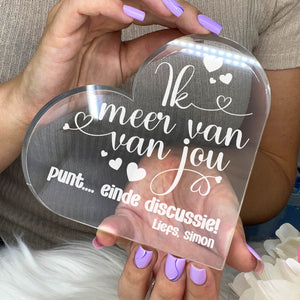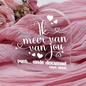 Doe vandaag nog een prachtig plexiglas hart met persoonlijke boodschap cadeau. Lasergegraveerd met eigen namen en een dikte van 1 cm.
