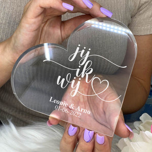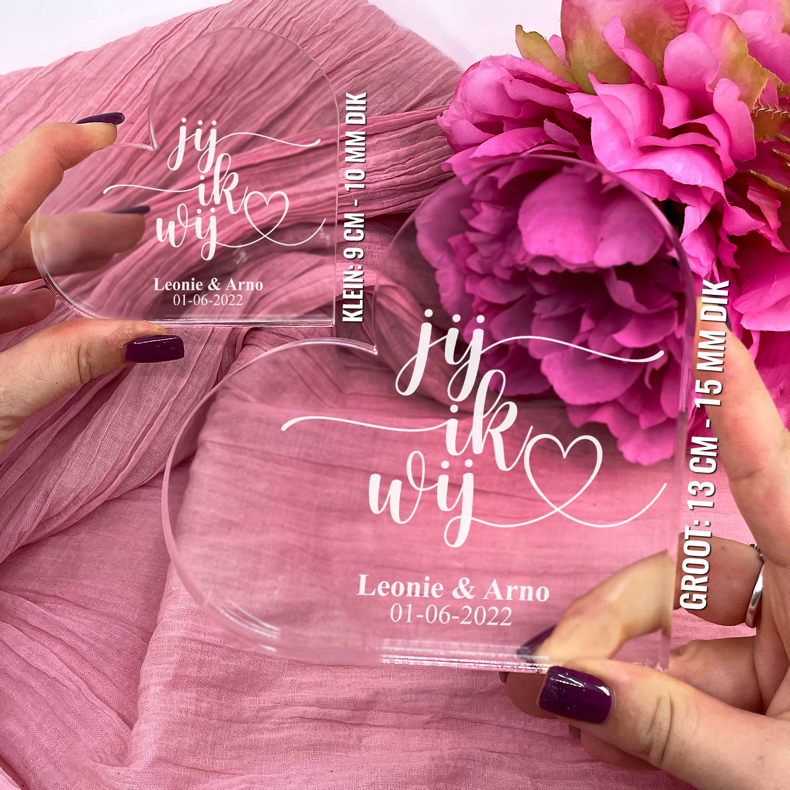 Doe vandaag nog een prachtig plexiglas hart met persoonlijke boodschap cadeau. Lasergegraveerd met eigen namen en een dikte van 1 cm.
