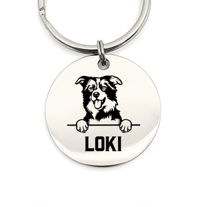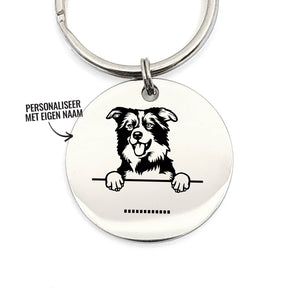 Zet op de puntjes (bijvoorbeeld de naam van je Border Collie) op het rondje en personaliseer daarmee deze mooie sleutelhanger