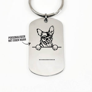 Chihuaha Met Naam Sleutelhanger. Op veler verzoek is het nu mogelijk om ook een eigen tekst op de dogtag te zetten. Wie ga jij verrassen met deze unieke gepersonaliseerde sleutelhanger?