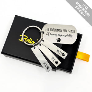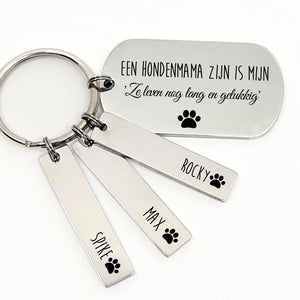 Een Hondenmama zijn is mijn 'ze leven nog lang en gelukkig" . voel jij dit ook zo? dan is deze RVS Sleutelhanger precies wat jij zoekt. de sleutelhanger is handgemaakt en kan worrden gepersonaliseerd met de namen van jou harige kindjes.