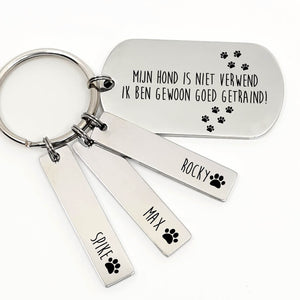Heb jij ook een trouwe viervoeter die de koninklijke luxe gewend is? Of ken jij iemand die zo'n lekker verwende hond heeft? Dan is deze huisdieren 'mijn hond is niet verwend ik ben gewoon goed getraind' sleutelhanger een mooi cadeau! Want zeg nou zelf, wie wilt nou niet de lieve hondenkindjes altijd bij zich kunnen dragen!
