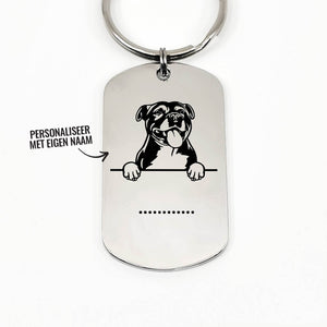 Stafford Bull Terrier Met Naam Sleutelhanger. Op veler verzoek is het nu mogelijk om ook een eigen tekst op de dogtag te zetten. Wie ga jij verrassen met deze unieke gepersonaliseerde sleutelhanger?