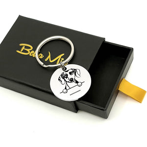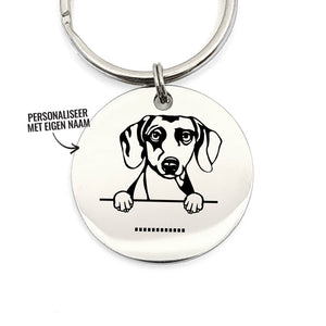 Zet op de puntjes (bijvoorbeeld de naam van je Teckel) op het rondje en personaliseer daarmee deze mooie sleutelhanger