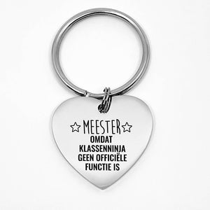 Jammer genoeg is klassenninja geen officiële functie, want die had zeker bij jouw meester gepast! Verras je meester nu met deze handgemaakte 'Meester, omdat klassenninja geen officiële functie is' sleutelhanger en laat hem hiermee weten dat je hem een echte toffe peer vind!