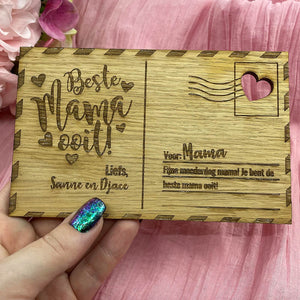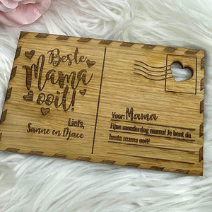 Prachtig gepersonaliseerd houten kaartje voor mama met eigen namen + eigen boodschap!