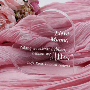 Niets is zo belangrijk als familie, maar dat wordt helaas niet altijd hardop gezegd. Laat je geliefde weten dat jullie samen ALLES zijn en geef diegene nu deze unieke glazen hart cadeau. Je kunt deze originele cadeau personaliseren door er zelf de namen aan toe te voegen.