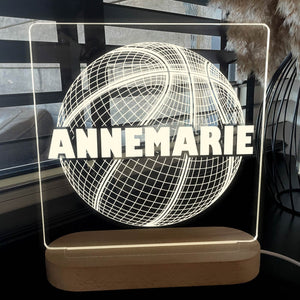 3D Nachtlampje voor een stoere slaapkamer. Afbeelding van een basketbal, compleet gepersonaliseerd met naam van jouw zoon/dochter.