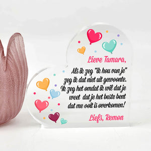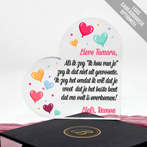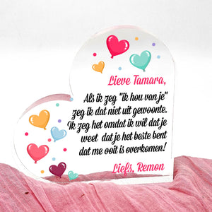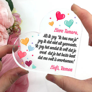 Doe vandaag nog een prachtig plexiglas hart met persoonlijke boodschap cadeau. Lasergegraveerd met eigen namen en een dikte van 1 cm.