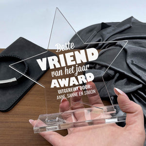 Is een goede vriend van jou bijna jarig? of wil je hem gewoon zomaar een leuk cadeau geven? Dan is deze 'beste vriend van het jaar!' het meest unieke cadeau om te geven! Je kunt hem personaliseren door er de namen die het award uitreiken aan toe te voegen. Zo zou je vriend dit voor altijd op zijn nachtkastje kunnen laten staan!