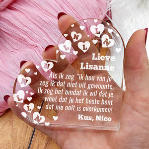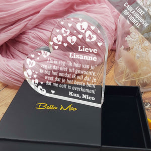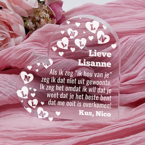 Doe vandaag nog een prachtig plexiglas hart met persoonlijke boodschap cadeau. Lasergegraveerd met eigen namen en een dikte van 1 cm.