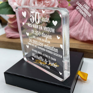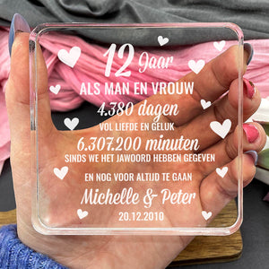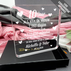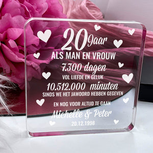 Doe vandaag nog een prachtig plexiglas Aandenken met persoonlijke boodschap cadeau. Lasergegraveerd met eigen namen en een dikte van 1 cm.