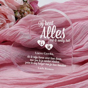 Doe vandaag nog een prachtig plexiglas hart met persoonlijke boodschap cadeau. Lasergegraveerd met eigen namen en een dikte van 1 cm.