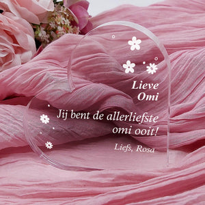 Zo'n lieve omi als die jij hebt is er één uit duizenden! Laat haar weten hoe je over haar denkt en geef haar nu deze originele glazen hart cadeau. Je kunt deze hart personaliseren door er zelf de namen aan toe te voegen.