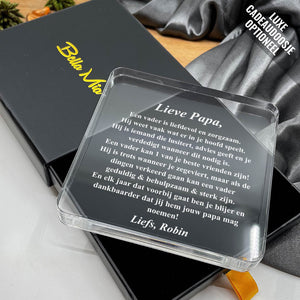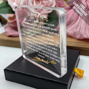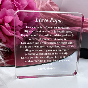Doe vandaag nog een prachtig plexiglas Aandenken met persoonlijke boodschap cadeau. Lasergegraveerd met eigen namen en een dikte van 1 cm.