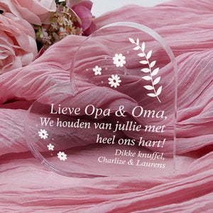 Doe vandaag nog een prachtig plexiglas hart met persoonlijke boodschap cadeau. Lasergegraveerd met eigen namen en een dikte van 1 cm.