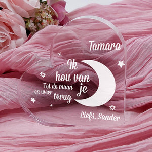 Doe vandaag nog een prachtig plexiglas hart met persoonlijke boodschap cadeau. Lasergegraveerd met eigen namen en een dikte van 1 cm.
