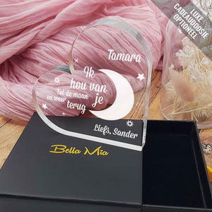 Geef dan nu deze prachtige glazen hart cadeau! Deze originele gift kan je personaliseren door er de naam van jezelf en die van je geliefde toe te voegen.