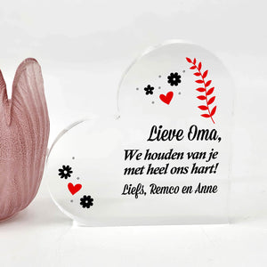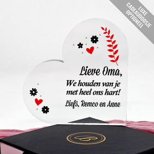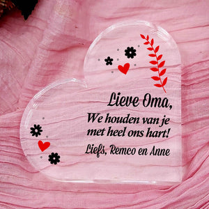 Vergeten jullie ook wel eens te zeggen dat je van iemand houdt? Laat haar dat nu weten door haar deze glazen hart met prachtige boodschap cadeau te geven! Je kunt deze originele cadeau personaliseren door er zelf namen aan toe te voegen.