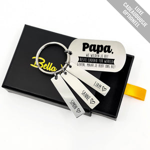 Het beste cadeau ter wereld heeft jullie vader al! Maar een kleinigheidje cadeau geven is natuurlijk ook leuk. Geef je papa nu deze originele sleutelhanger cadeau! Je kunt deze sleutelhanger personaliseren door er de namen van alle kinderen aan toe te voegen