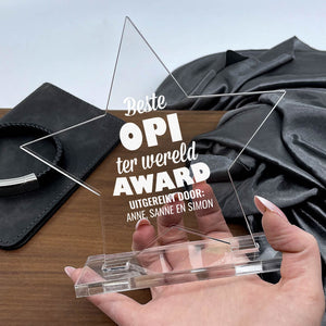 Zet opi dit jaar in het zonnetje met zijn eigen award van plexiglas. Compleet gepersonaliseerd met namen van de kleinkinderen. Een uniek cadeau!