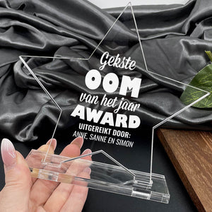 Zet jouw oom dit jaar in het zonnetje met zijn eigen award van plexiglas. Compleet gepersonaliseerd met namen van de neven en nichten. Een uniek cadeau!