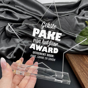 Zet pake dit jaar in het zonnetje met zijn eigen award van plexiglas. Compleet gepersonaliseerd met namen van de kleinkinderen. Een uniek cadeau!