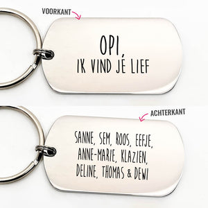 Jou opi staat altijd voor jou klaar. Samen beleven jullie de leukste avonturen. Veras bompa met deze mooie handgemaakte "Opi ik vind je lief" RVS sleutelhanger. En om het een nog persoonlijkere verassing te maken kun je de sleutelhanger personaliseren met de namen van al opi's kleinkinderen.
