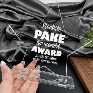 Zet pake dit jaar in het zonnetje met zijn eigen award van plexiglas. Compleet gepersonaliseerd met namen van de kleinkinderen. Een uniek cadeau!