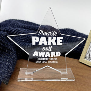 Zet pake dit jaar in het zonnetje met zijn eigen award van plexiglas. Compleet gepersonaliseerd met namen van de kleinkinderen. Een uniek cadeau!