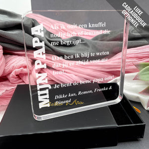 Doe vandaag nog een prachtig plexiglas Aandenken met persoonlijke boodschap cadeau. Lasergegraveerd met eigen namen en een dikte van 1 cm.