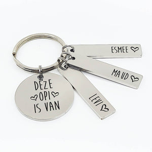 Heb jij een Opi die altijd voor je klaarstaat? Verras hem nu met deze 'Deze opi is van' sleutelhanger cadeau zodat hij weet dat je aan hem denkt! Je kunt de RVS sleutelhanger personaliseren door er de namen van al zijn kleinkinderen er aan toe te voegen. Zo zal hij jullie altijd bij zich kunnen dragen