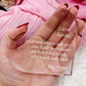 Doe vandaag nog een prachtig plexiglas hart met persoonlijke boodschap cadeau. Lasergegraveerd met eigen namen en een dikte van 1 cm.