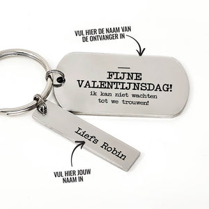 Fijne Valentijnsdag! Ik kan niet wachten tot we trouwen RVS sleutelhanger. Op veler verzoek is het nu mogelijk om ook een eigen tekst op de dogtag te zetten. Wie ga jij verrassen met deze unieke gepersonaliseerde sleutelhanger?