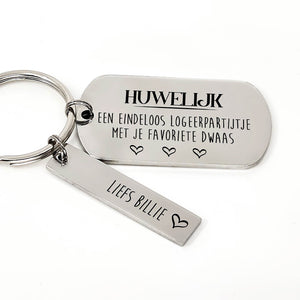Een logeerpartijtje is leuk, maar een eindeloos logeerpartijtje is veel leuker! Kijk daarom eens naar onze handgemaakte "Huwelijk, een eindeloos logeerpartijtje met je favoriete dwaas" RVS sleutelhanger. de sleutelhanger is te personaliseren door jou eigen naam toe te voegen. Zo word dit niet alleen een mooi maar ook persoonlijk cadeau.